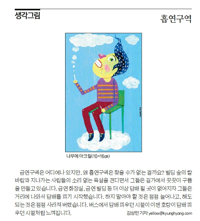 금연구역은 어디에나 있지만, 왜 흡연구역은 찾을 수가 없는 걸까요? 빌딩 숲의 칼바람과 지나가는 사람들의 소리 없는 욕설을 견디면서 그들은 길가에서 꿋꿋이 구름을 만들고 있습니다. 금연 화장실, 금연빌딩 등 더 이상 담배 필곳이 없어지자 그들은 거리에 나와서 담배를 피기 시작했습니다. 하지 말아야 할 것들은 점점 늘어나고, 해도 되는 것들은 점점 사라져 버렸습니다. 버스에서 담배 피우던 시절이 이젠 호랑이 담배 피우던 시절처럼 느껴집니다.