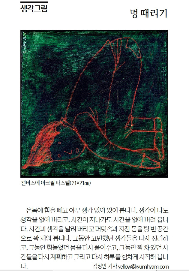 온몸에 힘을 빼고 아무 생각 없이 있어 봅니다. 생각이 나도 생각을 없애 버리고, 시간이 지나가도 시간을 없애 버려 봅니다. 시간과 생각을 날려 버리고 머릿속과 지친 몸을 텅 빈 공간으로 꽉 채워 봅니다. 그동안 고민했던 생각들을 다시 정리하고, 그동안 힘들었던 몸을 다시 풀어주고, 그동안 꽉 차 있던 시간들을 다시 계획하고 그리고 다시 하루를 힘차게 시작해 봅니다.