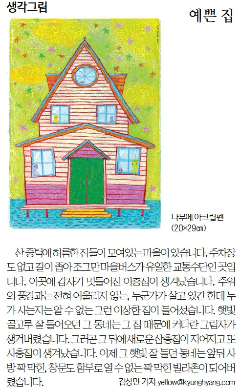 산 중턱에 허름한 집들이 모여있는 마을이 있습니다. 주차장도 없고 길이 좁아 조그만 마을버스만이 유일한 교통수단인 곳입니다. 이곳에 갑자기 멋들어진 이층 집이 생겨났습니다. 주위의 풍경과는 전혀 어울리지 않는, 누군가는 살고 있긴 한데 누가 살고 있는지는 알 수 없는 그런 이상한 집이 들어섰습니다. 햇볕 골고루 잘 들어오던 그 동네는 그 집 때문에 커다란 그림자가 생겨 버렸습니다. 그리곤 그 뒤에 새로운 삼층집이 생기고 또 사층 집이 생겨 났습니다. 이제 그 햇볕 잘 들던 동네는 앞뒤 사방 꽉 막힌 창문도 함부로 열 수 없는 꽉 막힌 빌라촌이 되어 버렸습니다.
