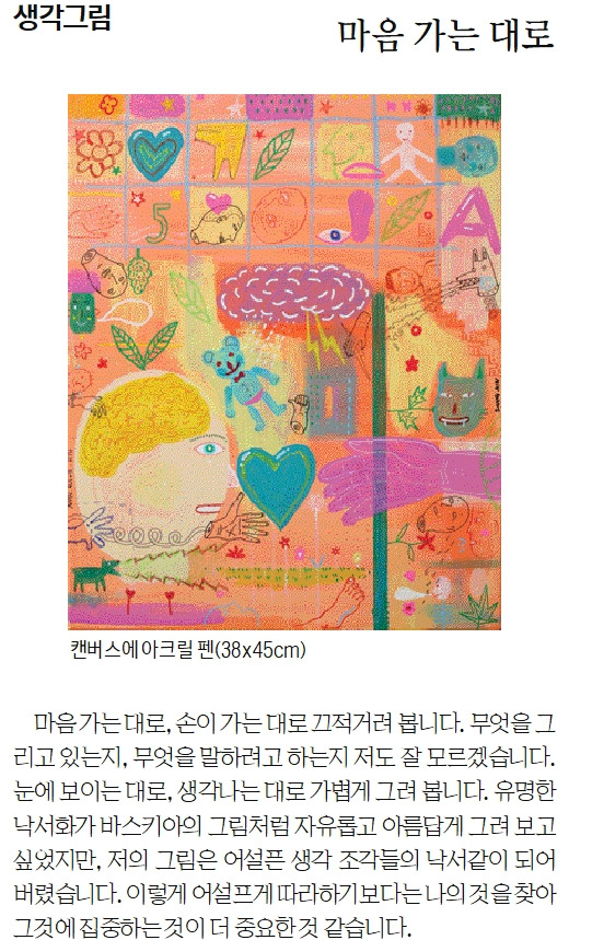 마음 가는 대로, 손이 가는 대로 끄적거려 봅니다. 무엇을 그리고 있는지, 무엇을 말하려고 하는지 저도 잘 모르겠습니다. 눈에 보이는 대로, 생각 나는 대로 가볍게 그려 봅니다. 유명한 낙서화가 바스키아의 그림처럼 자유롭고 아름답게 그려보고 싶었지만, 저의 그림은 어설픈 생각 조각들의 낙서 같이 되어 버렸습니다. 이렇게 어설프게 따라 하기보다는 나의 것을 찾아 그것에 집중하는 것이 더 중요한 것 같습니다.