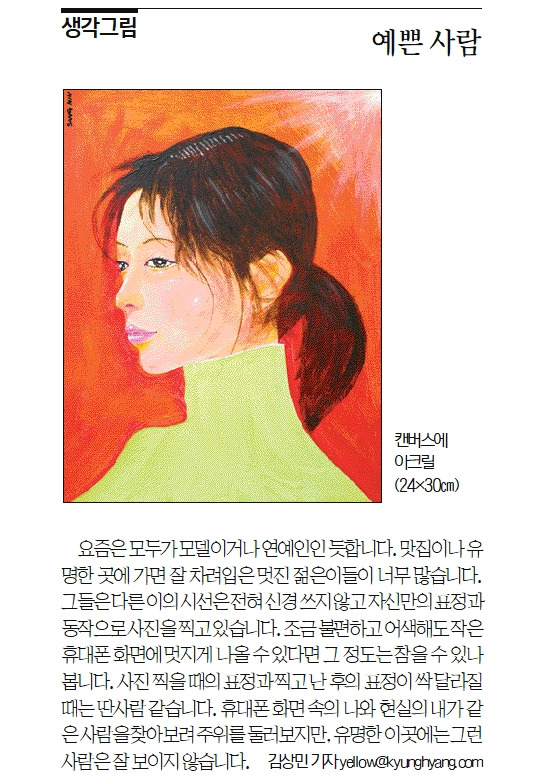 요즘은 모두가 모델이고 연예인 같습니다. 맛집이나 유명한 곳에 가면 잘 차려입은 멋진 젊은이들이 너무나 많습니다. 그들은 다른 사람들의 시선은 전혀 신경 쓰지 않고 자신만의 표정과 동작으로 사진을 찍고 있습니다. 조금 불편하고 어색해도 작은 휴대폰 화면에 멋지게 나올 수 있다면 그 정도는 참을 수 있나 봅니다. 사진 찍을 때의 표정과 찍고 난 후의 표정이 싹 바뀔 때는 딴 사람 같습니다. 휴대폰 화면 속의 나와 현실의 내가 같은 사람을 찾아보려 주위를 둘러보지만, 유명한 이곳에는 그런 사람은 잘 보이지 않습니다.