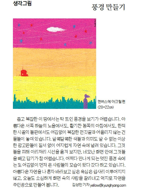 좁고 복잡한 이 땅에서는 탁 트인 풍경을 보기가 어렵습니다. 아름다운 서쪽 하늘의 노을에서도, 활기찬 동쪽의 아침에서도, 한적한 시골의 들판에서도 어김없이 복잡한 전깃줄과 어울리지 않는 건물들이 놓여 있습니다. 알록달록한 색들과 의미도 알 수 없는 이상한 광고판들이 질서 없이 어지럽게 자연 속에 널려 있습니다. 그것들을 피해 이리저리 시선을 옮겨 보지만, 네모난 화면 안에 그것들을 빼고 담기가 참 어렵습니다. 어쩌다 만나게 되는 멋진 풍경 속에는 또 어김없이 먼저 온 사람들의 모습이 왔다 갔다 하고 있습니다. 아름다운 자연을 나 혼자 바라보고 싶은 욕심은 쉽사리 이루어지지 않고, 오늘도 소심하게 화면 속의 사람을 잘라내고 억지로 자연을 주인공으로 만들어 봅니다.