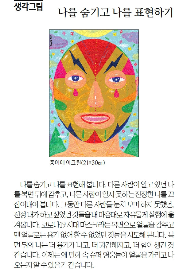 나를 숨기고 나를 표현해 봅니다. 다른 사람이 알고 있던 나를 복면 뒤에 감추고, 다른 사람이 알지 못하는 진정한 나를 끄집어내어 봅니다. 그동안 다른 사람들 눈치 보며 하지 못했던, 진정 내가 하고 싶었던 것들을 내 마음대로 자유롭게 실행해 옮겨봅니다. 코로나 시대 마스크라는 복면으로 얼굴을 감추고 맨 얼굴로는 용기 없어 할 수 없었던 것들을 시도해 봅니다. 복면 뒤의 나는 더 용기가 나고, 더 과감해지고, 더 힘이 생긴 것 같습니다. 이제는 왜 만화 속 슈퍼 영웅들이 얼굴을 가리고 나오는지 알 수 있을 거 같습니다.
