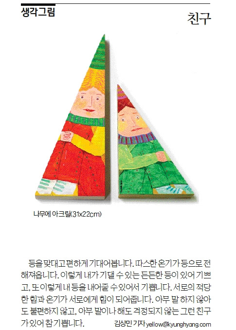 등을 맞대고 편하게 기대어 봅니다. 따스한 온기가 등으로 전해져 옵니다. 이렇게 내가 기댈 수 있는 든든한 등이 있어 기쁘고, 또 이렇게 내 등을 내어 줄 수 있어서 기쁩니다. 서로의 적당한 힘과 적당한 온기가 서로에게 힘이 되어 줍니다. 아무 말하지 않아도 불편하지 않고, 아무 말이나 해도 걱정되지 않는 그런 친구가 있어 참 기쁩니다.