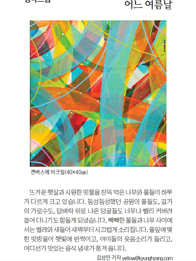 뜨거운 햇살과 시원한 빗물을 잔뜩 먹은 나무와 풀들이 하루가 다르게 크고 있습니다. 듬성듬성했던 공원 풀들도, 길가에 가로수도, 담벼락 위로 나온 덩굴들도 너무나 빨리 커버려 걸어 다니기도 힘들게 되었습니다. 빽빽한 풀들과 나무 사이에는 벌레와 새들이 새벽부터 시끄럽게 소리칩니다. 풀잎에 맺힌 빗방울이 햇빛에 반짝이고, 아이들의 웃음소리가 들리고, 어디선가 맛있는 음식 냄새가 풍겨옵니다.