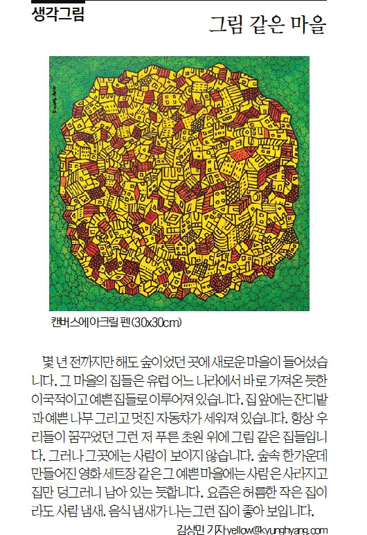 몇 년 전까지만 해도 숲이었던 곳에 새로운 마을이 들어섰습니다. 그 마을의 집들은 유럽 어느 나라에서 바로 가져온듯한 이국적이고 예쁜 집들로 이루어져 있습니다. 집 앞에는 잔디밭과 예쁜 나무 그리고 멋진 자동차가 세워져 있습니다. 항상 우리들이 꿈꾸었던 그런 저 푸른 초원 위에 그림 같은 집들입니다. 그러나 그곳에는 사람이 보이지 않습니다. 숲 속 한가운데 만들어진 영화 세트장 같은 그 예쁜 마을에는 사람은 사라지고 집만 덩그러니 남아 있는 듯합니다. 요즘은 허름한 작은집이라도 사람 냄새 음식 냄새가 나는 그런 집이 좋아 보입니다.