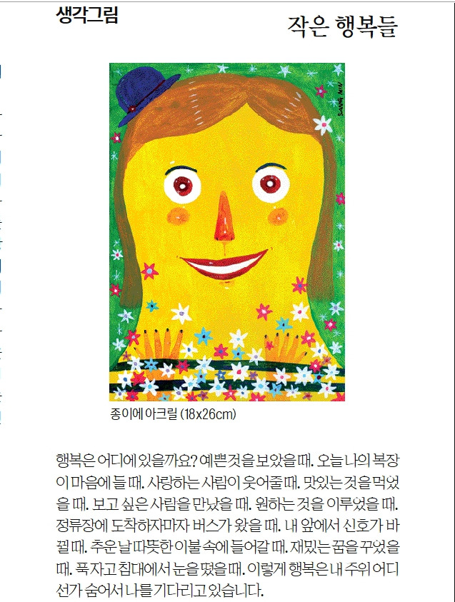 행복은 어디에 있을까요? 예쁜 것을 보았을 때. 오늘 나의 복장이 마음에 들 때. 사랑하는 사람이 웃어줄 때. 맛있는 것을 먹었을 때. 보고 싶은 사람을 만났을 때. 원하는 것을 이루었을 때. 정류장에 도착하자마자 버스가 왔을 때. 내 앞에서 신호가 바뀔 때. 추운 날 따뜻한 이불 속에 들어갈 때. 재밌는 꿈을 꾸었을 때. 푹 자고 침대에서 눈을 떴을 때. 이렇게 행복은 내 주위 어디선가 숨어서 나를 기다리고 있습니다.