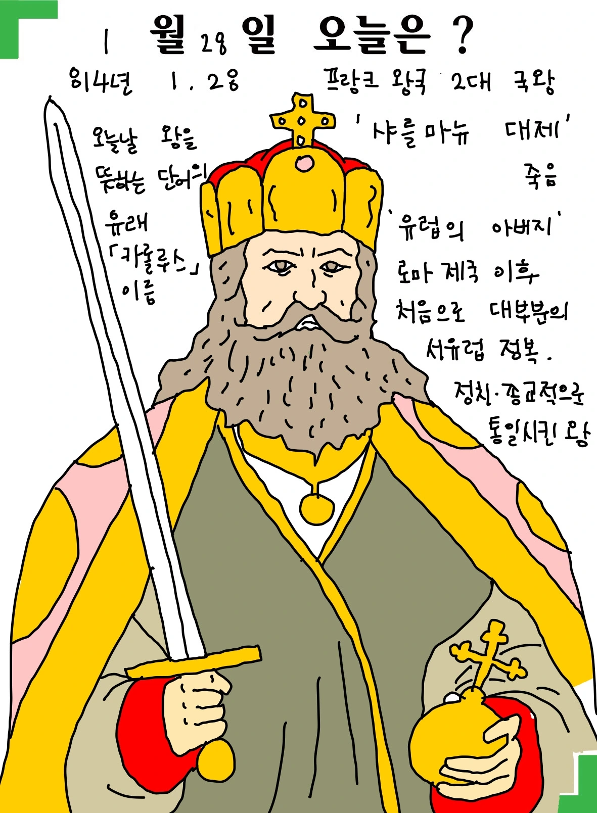 814년 프랑크왕국의 2대 국왕 샤를마뉴 대제 죽음. 그는 로마제국 이후 처음으로 대부분의 서유럽을 정복하여 정치 종교적으로. 통일시킨 왕을 유럽의 아버지라 불림. 오늘날 여러나라에서 왕을 뜻하는 단어는 카를루스의 이름에 서 유래한것. 폴란드,헝가리,세르비아,터키등에서