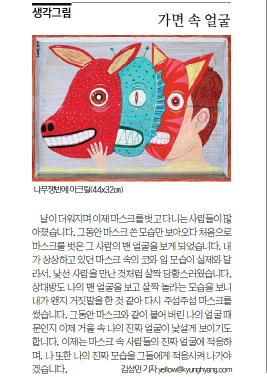 날이 더워지며 이제 마스크를 벗고 다니는 사람들이 많아졌습니다. 그동안 마스크 쓴 모습만 보아오다 처음으로 마스크를 벗은 그 사람의 맨 얼굴을 보게 되었습니다. 내가 상상하고 있던 마스크 속의 코와 입 모습이 실제와 달라서, 낯선 사람을 만난 것처럼 살짝 당황스러웠습니다. 상대방도 나의 맨 얼굴을 보고 살짝 놀라는 모습을 보니 내가 왠지 거짓말을 한 것 같아 다시 주섬주섬 마스크를 썼습니다. 그동안 마스크와 같이 붙어 버린 나의 얼굴 때문인지 이제 거울 속 나의 진짜 얼굴이 낯설게 보이기도 합니다. 이제는 마스크 속 사람들의 진짜 얼굴에 적응하며, 나 또한 나의 진짜 모습을 그들에게 적응시켜 나가야겠습니다.