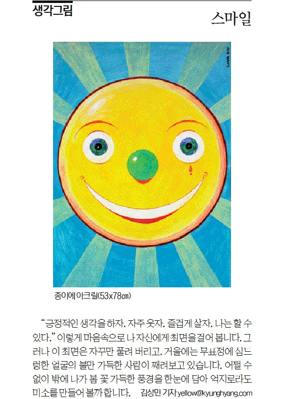 "긍정적인 생각을 하자. 자주 웃자. 즐겁게 살자. 나는 할 수 있다." 이렇게 마음속으로 나 자신에게 최면을 걸어 봅니다. 그러나 이 최면은 자꾸만 풀려 버리고, 거울에는 무표정에 심드렁한 얼굴의 불만이 가득한 사람이 째려보고 있습니다. 어쩔 수 없이 밖에 나가 봄 꽃 가득한 풍경을 한눈에 담아 억지로라도 미소를 만들어 볼까 합니다.