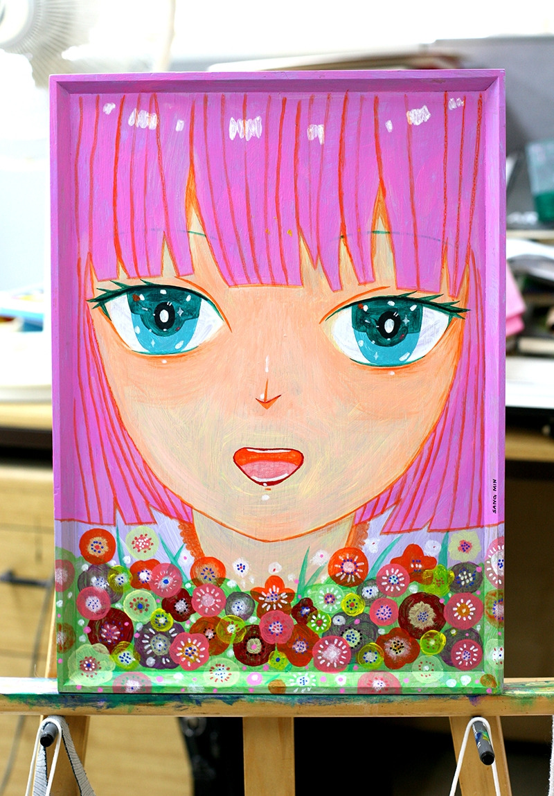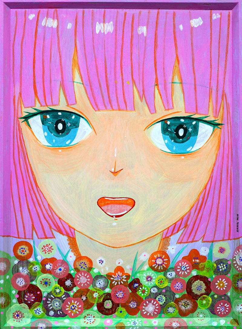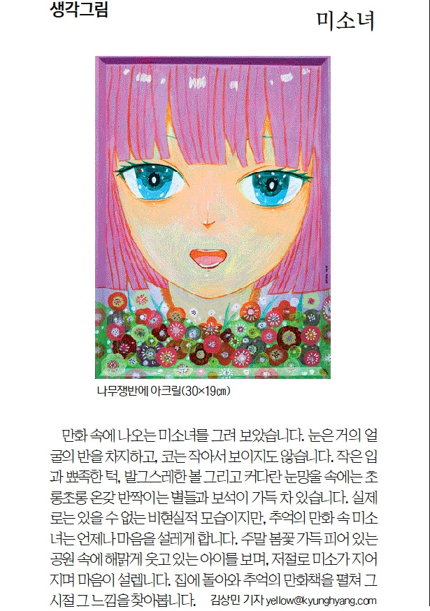 만화 속에 나오는 미소녀를 그려 보았습니다. 눈은 거의 얼굴의 반을 차지하고, 코는 작아서 보이지도 않습니다. 작은 입과 뾰족한 턱, 발그스레한 볼 그리고 커다란 눈망울 속에는 초롱초롱 온갖 반짝이는 별들과 보석이 가득 차 있습니다. 실제로는 있을 수 없는 비현실적 모습이지만, 추억의 만화 속 미소녀는 언제나 마음을 설레게 합니다. 주말 봄꽃 가득 피어 있는 공원 속 해맑게 웃고 있는 아이를 보며, 저절로 미소가 지어지며 마음이 설렙니다. 집에 돌아와 추억의 만화책을 펼쳐 그 시절 그 느낌을 찾아봅니다.