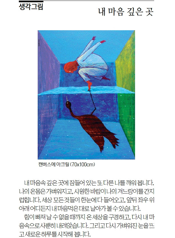 내 마음속 깊은 곳에 잠들어 있는 또 다른 나를 깨워 봅니다. 나의 온몸은 가벼워지고, 시원한 바람이 나의 겨드랑이를 간지럽힙니다. 세상 모든 것들이 한눈에 다 들어오고, 앞 뒤 좌 우 위아래 어디든지 내 마음먹은 대로 날아가 볼 수 있습니다. 힘이 빠져 날 수 없을 때까지 온 세상을 구경하고, 다시 내 마음속으로 사뿐히 내려앉습니다. 그리고 다시 가벼워진 눈을 뜨고 새로운 하루를 시작해 봅니다.