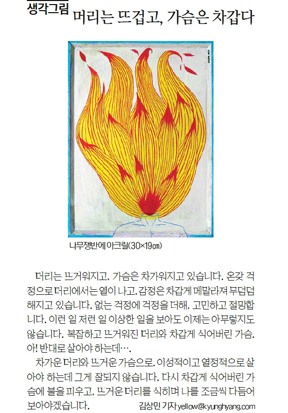 머리는 뜨거워지고, 가슴은 차가워지고 있습니다. 온갖 걱정으로 머리에서는 열이 나고, 감정은 차갑게 메말라져 무덤덤해지고 있습니다. 없는 걱정에 걱정을 더해, 고민하고 절망합니다. 이런 일 저런 일 이상한 일을 보아도 이제는 아무렇지도 않습니다. 복잡하고 뜨거워진 머리와 차갑게 식어버린 가슴. 아! 반대로 살아야 하는데... 차가운 머리와 뜨거운 가슴으로, 이성적이고 열정적으로 살아야 하는데 그게 잘 되지 않습니다. 다시 차갑게 식어버린 가슴에 불을 피우고, 뜨거운 머리를 식히며 나를 조금씩 다듬어 보아야겠습니다.