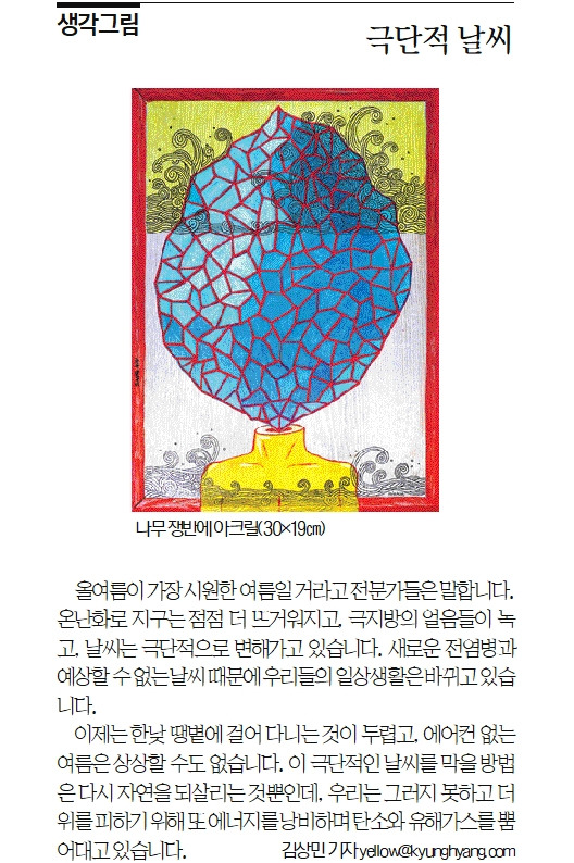 올여름이 가장 시원한 여름일 거라고 전문가들은 말합니다. 온난화로 지구는 점점 더 뜨거워지고, 극지방의 얼음들이 녹고, 날씨는 극단적으로 변해가고 있습니다. 새로운 전염병과 예상할 수 없는 날씨 때문에 우리들의 일상생활은 바뀌고 있습니다. 이제는 한낮 땡볕에 걸어 다니는 것이 두렵고, 에어컨 없는 여름은 상상할 수도 없습니다. 이 극단적인 날씨를 막을 방법은 다시 자연을 되살리는 것뿐인데, 우리는 그러지 못하고 더위를 피하기 위해 또 에너지를 낭비하며 탄소와 유해가스를 뿜어대고 있습니다.
