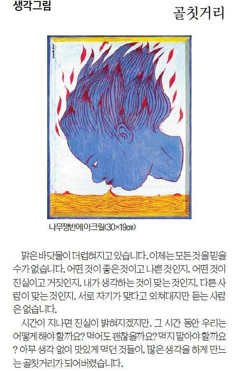 맑은 바닷물이 더럽혀지고 있습니다. 이제는 모든 것들을 믿을 수가 없습니다. 어떤 것이 좋은 것이고 나쁜 것인지, 어떤 것이 진실이고 거짓인지. 내가 생각하는 것이 맞는 것인지, 다른 사람이 맞는 것인지. 서로 자기가 맞다고 외쳐대지만, 듣는 사람은 없습니다. 시간이 지나면 진실이 밝혀지겠지만, 그 시간 동안 우리는 어떻게 해야 할까요? 먹어도 괜찮을까요? 먹지 말아야 할까요? 아무 생각 없이 맛있게 먹던 것들이, 많은 생각을 하게 만드는 골칫거리가 되어 버렸습니다.