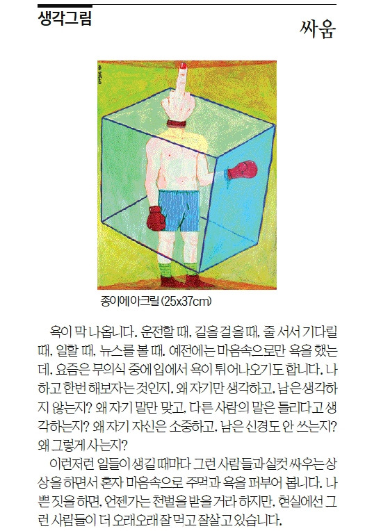 욕이 막 나옵니다. 운전할 때, 길을 걸을 때, 줄 서서 기다릴 때, 일을 할 때, 뉴스를 볼 때. 예전에는 마음속으로 만 욕을 했는데, 요즘은 무의식 중에 입에서 욕이 튀어나오기도 합니다. 나 하고 한번 해보자는 것인지. 왜 자기만 생각하고, 남은 생각하지 않는지? 왜 자기 말만 맞고, 다른 사람의 말은 틀리다고 생각하는지? 왜 자기 자신은 소중하고, 남은 신경도 안 쓰는지? 왜 그렇게 사는지? 이런저런 일들이 생길 때마다 혼자 마음속으로 그런 사람들과 실컷 싸우는 상상을 하며 마음속으로 주먹과 욕을 퍼부어 봅니다. 나쁜 짓을 하면, 언젠간 천벌을 받을 거라 하지만, 현실에선 그런 사람들이 더 오래오래 잘먹고 잘살고 있습니다.