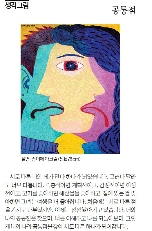 서로 다른 나와 네가 만나 하나가 되었습니다. 그러나 달라도 너무 다릅니다. 즉흥적이면 계획적이고, 감정적이면 이성적이고, 고기를 좋아하면 해산물을 좋아하고, 집에 있는 걸 좋아하면 그녀는 여행을 더 좋아합니다. 처음에는 서로 다른 점을 가지고 다투었지만, 이제는 점점 닮아가고 있습니다. 너와 나의 공통점을 찾으며, 너를 이해하고 나를 되돌아보며 그렇게 너와 나의 공통점을 찾아 서로 다른 하나가 되어갑니다.
