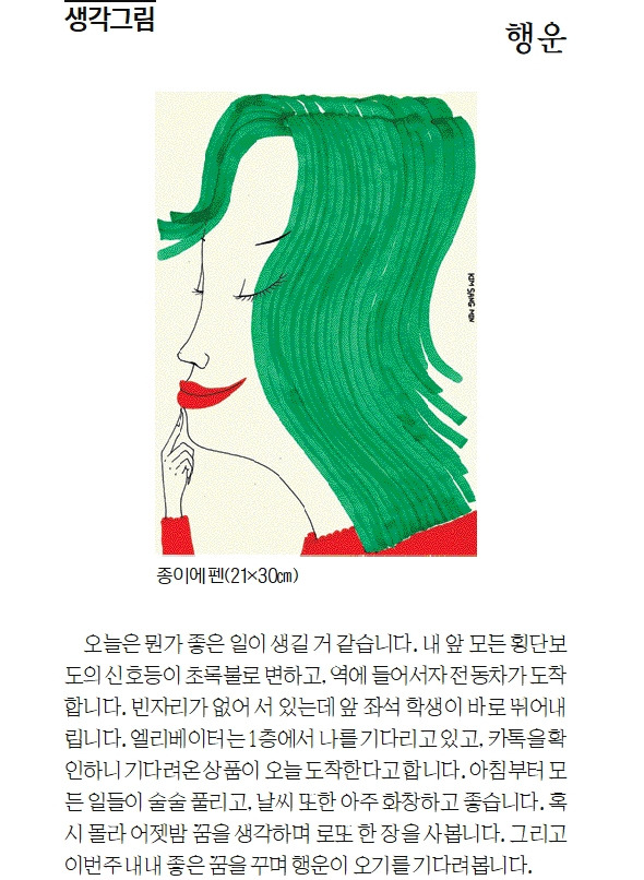 오늘은 뭔가 좋은 일이 생길 거 같습니다. 내 앞 모든 횡단보도의 신호등이 초록불로 변하고, 역에 들어서자 지하철이 도착합니다. 자리 없어 서 있는데 앞 좌석 학생 바로 뛰어내립니다. 엘리베이터는 일층에서 나를 기다리고 있고, 카톡을 확인하니 내가 기다리던 상품이 오늘 도착한다고 합니다. 아침부터 모든 일들이 술술 풀리고, 날씨 또한 아주 화창하고 좋습니다. 혹시 몰라 어젯밤 꿈을 생각하며 로또 한 장을 사봅니다. 그리고 이번주 내내 좋은 꿈을 꾸며 행운이 오기를 기다려 봅니다.