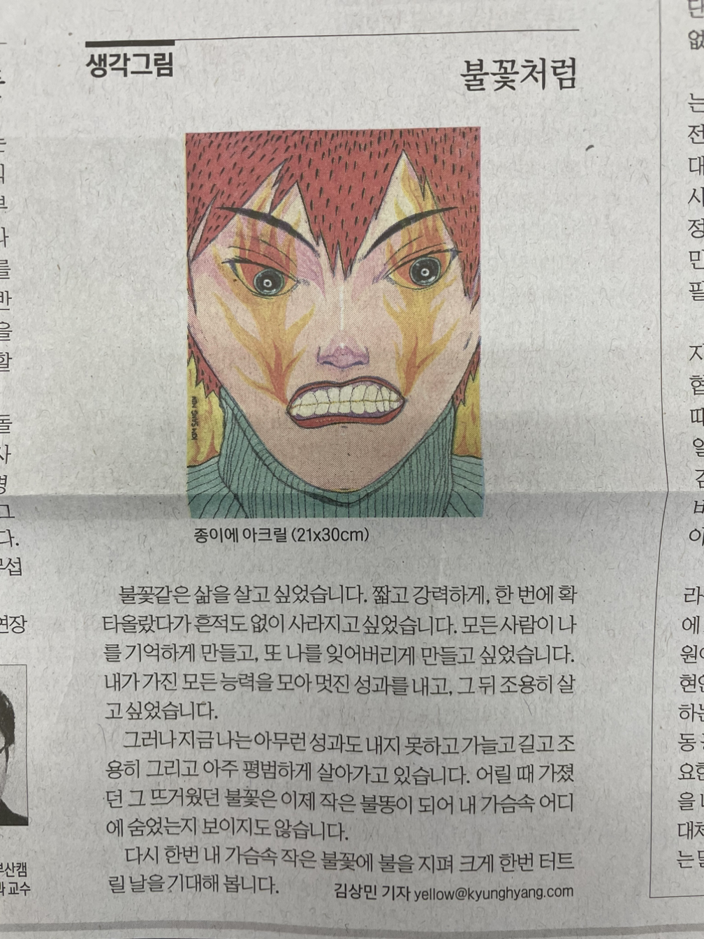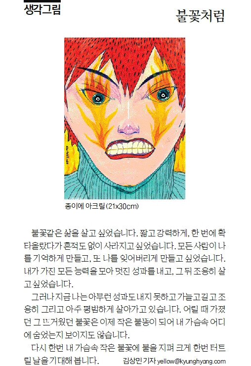 불꽃같은 삶을 살고 싶었습니다. 짧고 강력하게, 한 번에 확 타올랐다가 흔적도 없이 사라지고 싶었습니다. 모든 사람들이 나를 기억하게 만들고, 또 나를 잊어버리게 만들고 싶었습니다. 내가 가진 모든 능력을 모아 멋진 성과를 내고, 그 뒤 조용히 살고 싶었습니다. 그러나 지금 나는 아무런 성과도 내지 못하고 가늘고 길고 조용히 그리고 아주 평범하게 살아가고 있습니다. 어릴 때 가졌던 그 뜨거웠던 불꽃은 이제 작은 불똥이 되어 내 가슴속 어디에 숨었는지 보이지도 않습니다. 다시 한번 내 가슴속 작은 불꽃에 불을 지펴 크게 한번 터트릴날을 기대해 봅니다.