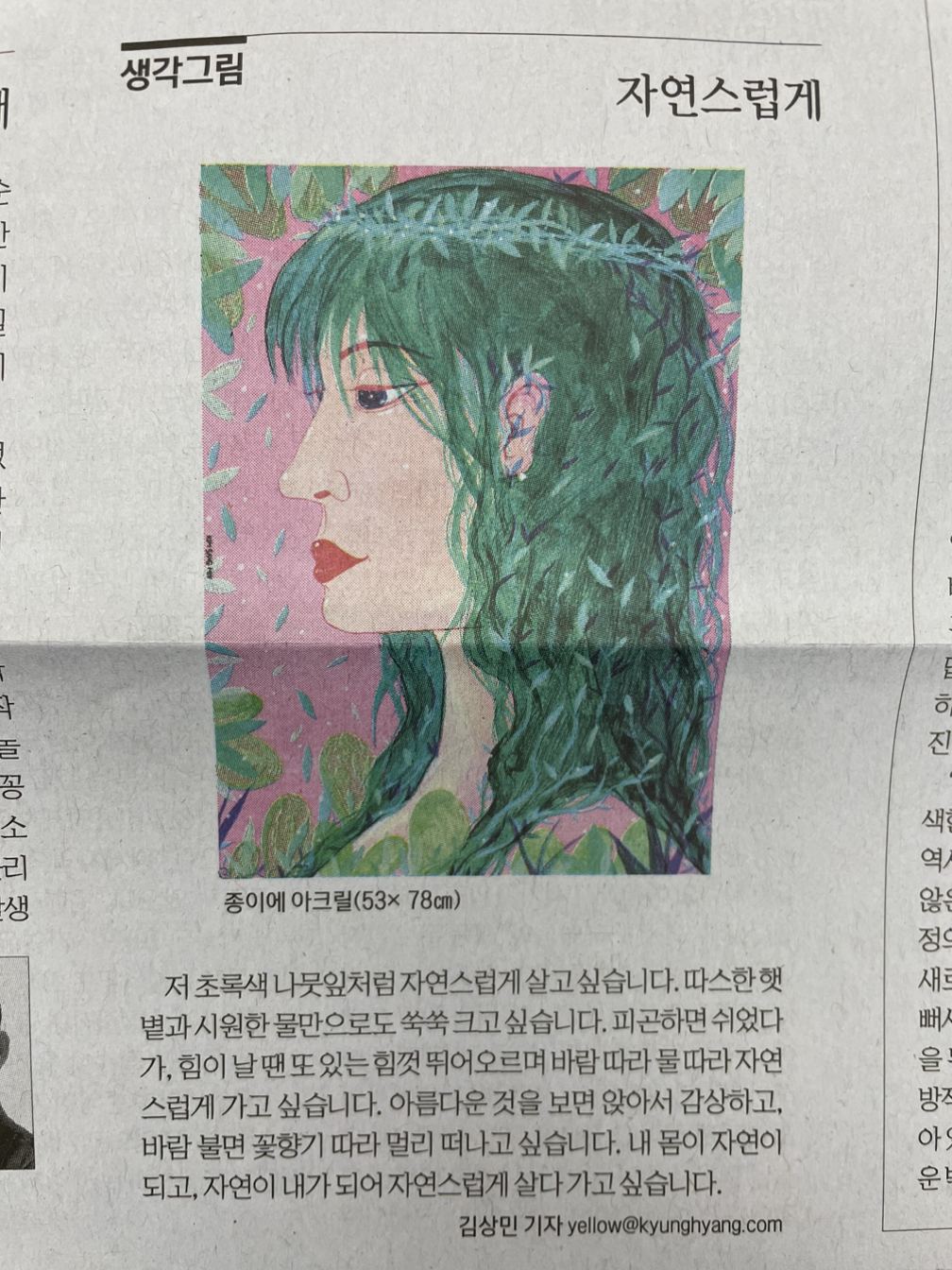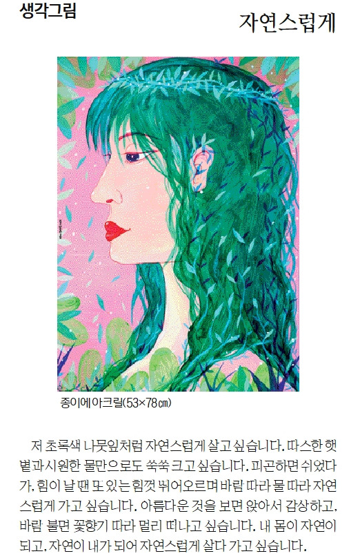 저 초록색 나뭇잎처럼 자연스럽게 살고 싶습니다. 따스한 햇빛과 시원한 물만으로도 쑥쑥 크고 싶습니다. 피곤하면 쉬었다가, 힘이 날 땐 또 있는 힘껏 뛰어오르며 바람 따라 물 따라 자연스럽게 가고 싶습니다. 아름다운 것을 보면 앉아서 감상하고, 바람 불면 꽃향기 따라 멀리 떠나고 싶습니다. 내 몸이 자연이 되고, 자연이 내가 되어 자연스럽게 살다 가고 싶습니다.