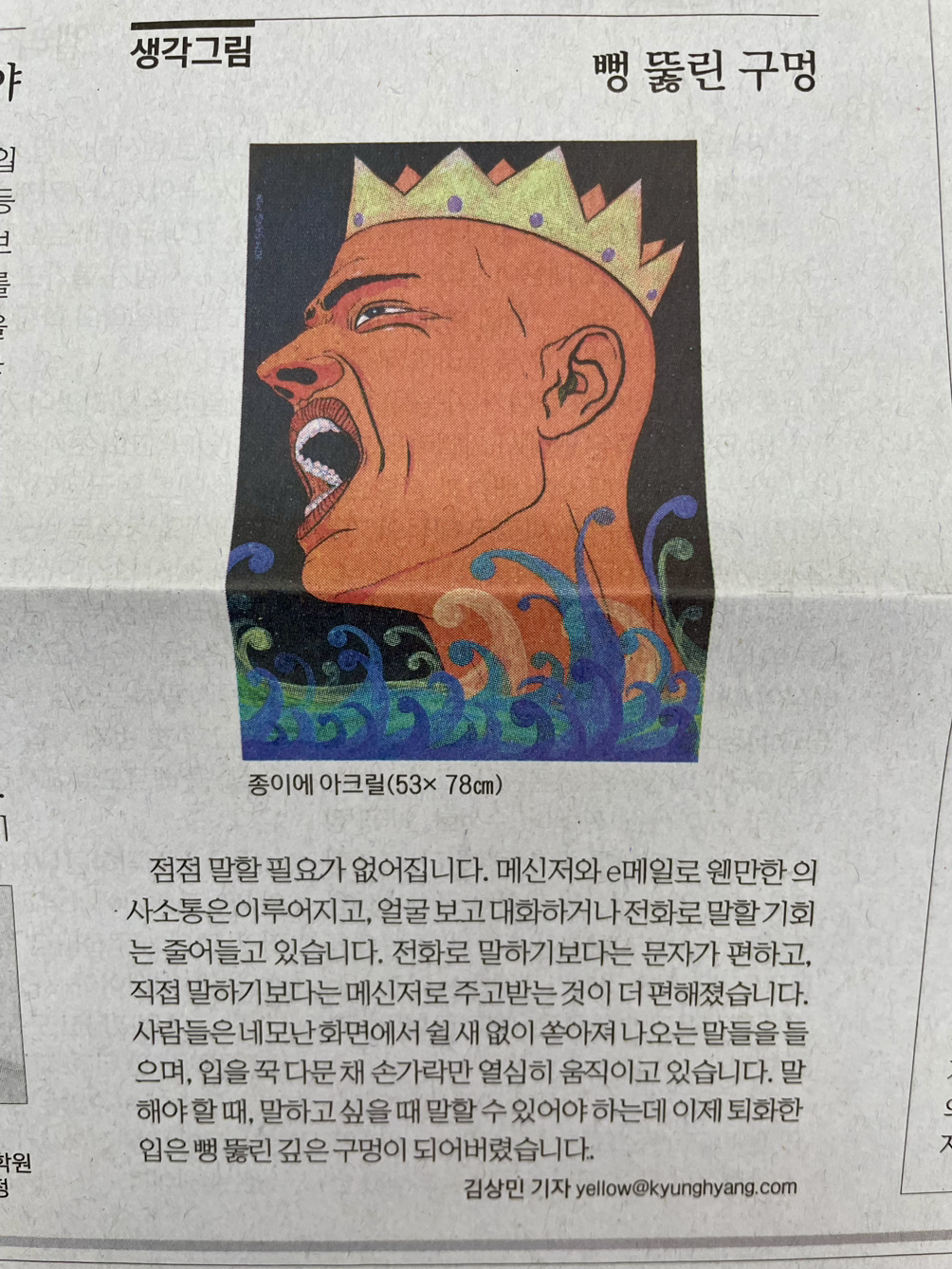 점점 말할 필요가 없어집니다. 메신저와 메일로 웬만한 의사소통은 이루어지고, 얼굴 보고 대화하거나, 전화로 말할 기회는 점점 줄어들고 있습니다. 전화로 말하기보다는 문자가 편하고, 직접 말하기보다는 메신저로 주고받는 것이 더 편해졌습니다. 사람들은 네모난 화면에서 쉴 새 없이 쏟아져 나오는 말들을 들으며, 입을 꾹 다문채 손가락만 열심히 움직이고 있습니다. 말해야 할 때, 말하고 싶을 때, 말할 수 있어야 하는데 이제는 퇴화 돼버린 입은 뻥 뚫린 깊은 구멍이 되어 버렸습니다.