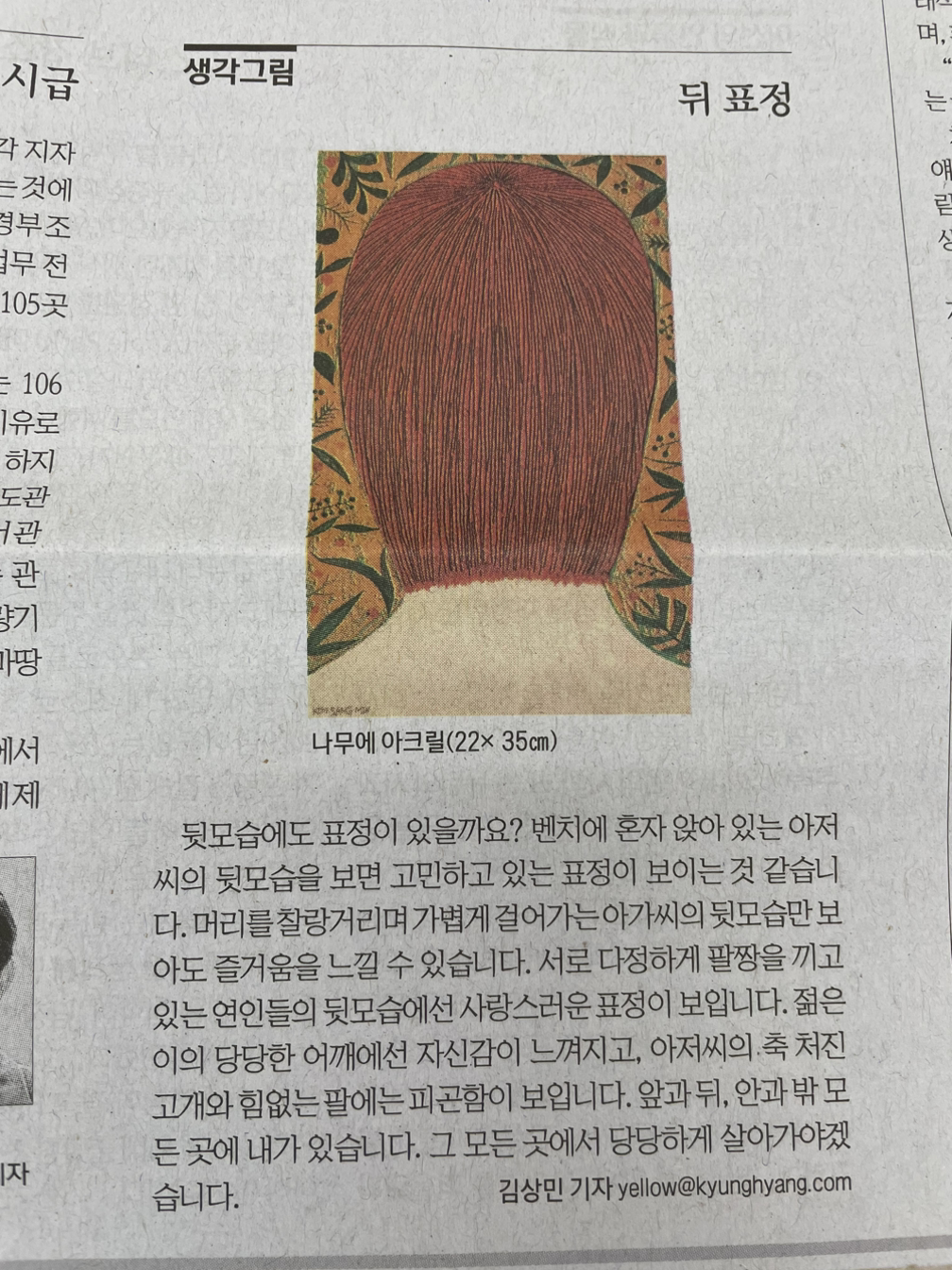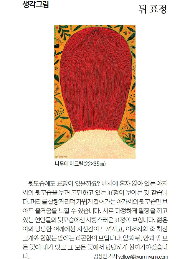 뒷모습에도 표정이 있을까요? 벤치에 혼자 앉아 있는 아저씨의 뒷모습을 보면 고민하고 있는 표정이 보이는 것 같습니다. 머리를 찰랑거리며 가볍게 걸어가는 아가씨의 뒷모습만 보아도 즐거움을 느낄 수 있습니다. 서로 다정하게 팔짱 끼고 있는 연인들의 뒷모습에선 사랑스러운 표정이 보입니다. 젊은이의 당당한 어깨에선 자신감이 느껴지고, 아저씨의 축 쳐진 고개와 힘없는 팔에는 피곤함이 보입니다. 앞과 뒤, 안과 밖 모든 곳에 내가 있고 그 모든 곳에서 당당하게 살아가야겠습니다.