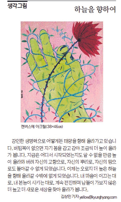 강인한 생명력으로 어떻게든 태양을 향해 올라가고 있습니다. 버팀목이 없으면 자기 몸을 감고 감아 조금씩 더 높이 올라가 봅니다. 지금은 어디서 시작되었는지도 알 수 없을 만큼 높이 올라와 버려 자신의 고향으로, 자신의 뿌리로, 자신의 땅으로도 돌아갈 수 없게 되었습니다. 이제는 오로지 더 높은 하늘을 향해 올라갈 수밖에 없데 되었습니다. 내 마음이 이끄는 대로, 내 본능이 시키는 대로, 계속 전진하며 남들이 가보지 않은 더 높고 더 새로운 세상을 찾아 올라가 봅니다.