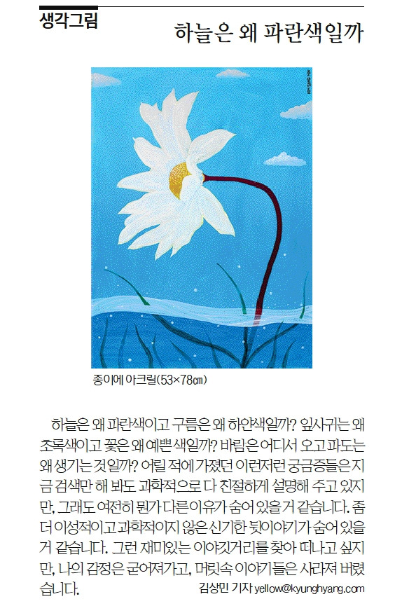 하늘은 왜 파란색이고 구름은 왜 하얀색일까? 잎사귀는 왜 초록색이고 꽃은 왜 예쁜 색일까? 바람은 어디서 오고 파도는 왜 생기는 것일까? 어릴 적에 가졌던 이런저런 궁금증들은 지금 검색만 해 봐도 과학적으로 다 친절하게 설명해 주고 있지만, 그래도 여전히 뭔가 다른 이유가 숨어 있을 거 같습니다. 좀 더 이성적이고 과학적이지 않는 신기한 뒷이야기가 숨어있을 거 같습니다. 그런 재미있는 이야깃거리를 찾아 떠나고 싶지만, 나의 감정은 굳어져가고, 머릿속 이야기들은 사라져 버렸습니다.