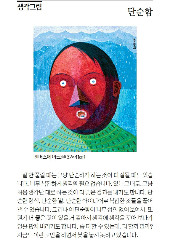 잘 안 풀릴 때는 그냥 단순하게 하는 것이 더 잘 될 때도 있습니다. 너무 복잡하게 생각할 필요 없습니다. 있는 그대로, 그냥 처음 생각난 대로 하는 것이 더 좋은 결과를 내기도 합니다. 단순한 형식, 단순한 말, 단순한 아이디어로 복잡한 것들을 풀어낼 수 있습니다. 그러나 이 단순함이 너무 성의 없어 보여서, 또 뭔가 더 좋은 것이 있을 거 같아서 생각에 생각을 꼬아 보다가 일을 망쳐 버리기도 합니다. 좀 더 할 수 있는데, 더 할까 말까? 지금도 이런 고민을 하면서 붓을 놓지 못하고 있습니다.