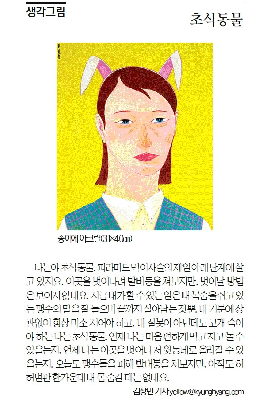 나는야 초식동물. 피라미드 먹이사슬의 제일 아랫단계에 살고 있지요. 이곳을 벗어나려 발버둥 쳐 보지만, 벗어날 방법은 보이지 않네요. 지금 내가 할 수 있는 일은 내 목숨을 쥐고 있는 맹수의 말을 잘 들으며 끝까지 살아남는 것뿐. 내 기분에 상관없이 항상 미소 지어야 하고, 내 잘못이 아닌데도 고개 숙여야 하는 나는 초식동물. 언제 나는 마음 편하게 먹고 자고 놀 수 있을는지, 언제 나는 이곳을 벗어나 저 윗동네로 올라갈 수 있을는지. 오늘도 맹수들을 피해 발버둥을 쳐보지만, 아직도 허허벌판 한가운데 내 몸 숨길 데는 없네요.