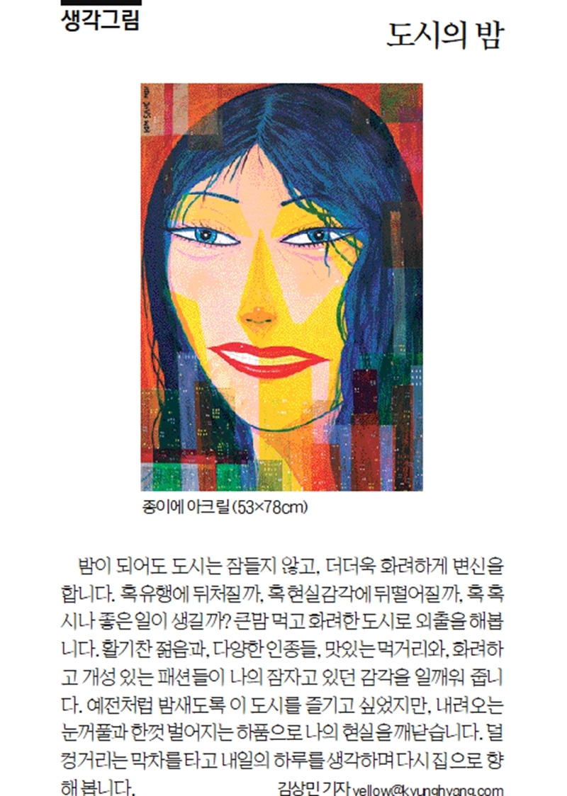 밤이 되어도 도시는 잠들지 않고, 더더욱 화려하게 변신을 합니다. 혹 유행에 뒤처질까, 혹 현실감각에 뒤떨어질까, 혹 혹시나 좋은 일이 생길까? 큰맘 먹고 화려한 도시로 외출을 해봅니다. 활기찬 젊음과, 다양한 인종들, 맛있는 먹거리와, 화려하고 개성 있는 패션들이 나의 잠자고 있던 감각을 일깨워 줍니다. 예전처럼 밤새도록 이 도시를 즐기고 싶었지만, 내려오는 눈꺼풀과 한껏 벌어지는 하품으로 나의 현실을 깨닫습니다. 덜컹거리는 막차를 타고 내일의 하루를 생각하며 다시 집으로 향해 봅니다.