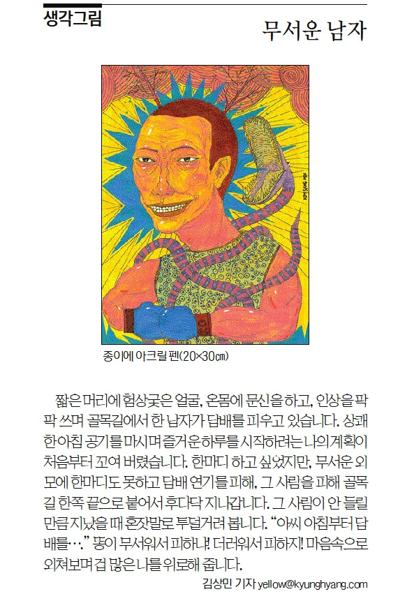 짧은 머리에 험상궂은 얼굴, 온몸에 문신을 하고, 인상을 팍팍 쓰며 골목길에서 한 남자가 담배를 피우고 있습니다. 상쾌한 아침공기를 마시며 즐거운 하루를 시작하려는 나의 계획이 처음부터 꼬여 버렸습니다. 한마디 하고 싶었지만, 무서운 외모에 한마디도 못하고 담배연기를 피해, 그 사람을 피해 골목길 한쪽 끝으로 붙어서 후다닥 지나갑니다. 그 사람이 안 들릴 만큼 지났을 때 혼잣말로 투덜거려 봅니다. "아씨 아침부터 담배를..." 똥이 무서워서 피하냐! 더러워서 피하지! 마음속으로 외쳐보며 겁 많은 나를 위로해 줍니다.