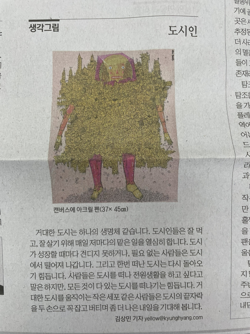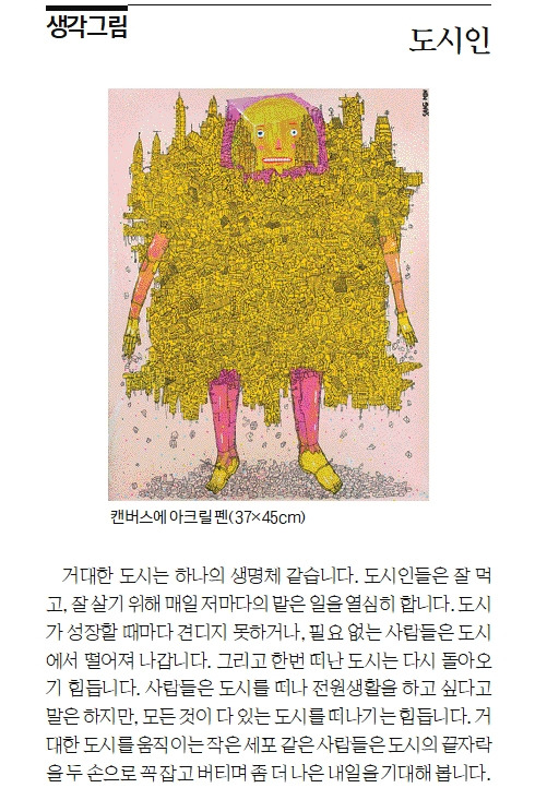 거대한 도시는 하나의 생명체 같습니다. 도시인들은 잘 먹고, 잘 살기 위해 매일 저마다의 맡은 일을 열심히 합니다. 도시가 성장할 때마다 견디지 못하거나, 필요 없는 사람들은 도시에서 떨어져 나갑니다. 그리고 한번 떠난 도시는 다시 돌아오기 힘듭니다. 사람들은 도시를 떠나 전원생활을 하고 싶다고 말은 하지만, 모든 것이 다 있는 도시를 떠나기는 힘듭니다. 거대한 도시를 움직이는 작은 세포 같은 사람들은 도시의 끝자락을 두 손으로 꼭 잡고 버티며 좀 더 나은 내일을 기대해 봅니다.