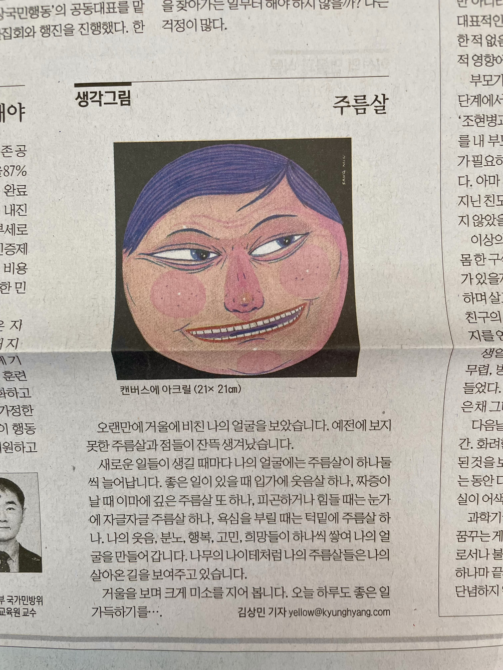 오래간만에 거울에 비친 나의 얼굴을 보았습니다. 예전에 보지 못했던 주름살과 점들이 잔뜩 생겨 났습니다. 새로운 일들이 생길 때마다 나의 얼굴에는 주름살이 하나둘씩 늘어납니다. 좋은 일이 있을 때 입가에 웃음살 하나, 짜증이 날 때 이마에 깊은 주름살 또 하나, 피곤하거나 힘들 때는 눈가에 자글자글 주름살 하나, 욕심을 부릴 때는 턱밑에 주름살 하나. 나의 웃음, 분노, 행복, 고민, 희망들이 하나씩 쌓여 나의 얼굴을 만들어 갑니다. 나무의 나이테처럼 나의 주름살들은 나의 살아온 길을 보여주고 있습니다. 거울을 보며 크게 미소를 지어 봅니다. 오늘 하루도 좋은 일 가득하기를...
