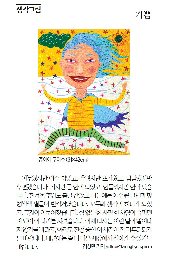 어두웠지만 아주 밝았고, 추웠지만 뜨거웠고, 답답했지만 후련했습니다. 작지만 큰 힘이 되었고, 힘들었지만 힘이 났습니다. 한겨울 추위도 봄날 같았고, 하늘에는 아주 큰 달님과 형형색색 별들이 반짝거렸습니다. 모두의 생각이 하나가 되었고, 그것이 이루어졌습니다. 힘없는 한 사람 한 사람이 슈퍼맨이 되어 이 나라를 지켰습니다. 이제 다시는 이런 일이 일어나지 않기를 바라고, 아직도 진행 중인 이 사건이 잘 마무리되기를 바랍니다. 내년에는 좀 더 나은 세상에서 살아갈 수 있기를 바랍니다.