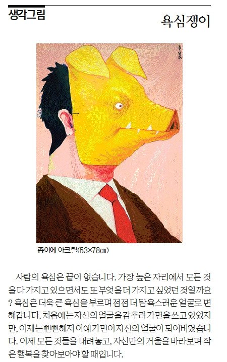 사람의 욕심은 끝이 없습니다. 가장 높은 자리에서 그 모든 것들을 다 가지고 있으면서도 또 무엇을 더 가지고 싶었던 것일까요? 욕심은 더 큰 욕심을 부르며 점점 더 탐욕스러운 얼굴로 변해 갑니다. 처음에는 자신의 얼굴을 감추려 가면을 쓰고 있었지만, 이제는 뻔뻔해져 아예 가면이 자신의 얼굴이 되어 버렸습니다. 이제 모든 것들을 내려놓고, 자신만의 거울을 바라보며 나의 작은 행복을 찾아보아야 할 때입니다.