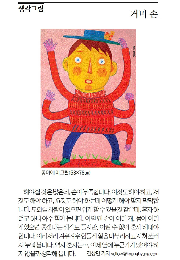 해야 할 것은 많은데, 손이 부족합니다. 이것도 해야 하고, 저것도 해야 하고, 요것도 해야 하는데 어떻게 해야 할지 막막합니다. 도와줄 사람이 있으면 쉽게 할 수 있을 것 같은데, 혼자 하려고 하니 아주 힘이 듭니다. 이럴 땐 손이 여러 개, 몸이 여러 개였으면 좋겠다는 생각도 들지만, 어쩔 수 없이 혼자 해내야 합니다. 이리저리 겨우겨우 힘들게 일을 마무리하고 지쳐 쓰러져 누워 봅니다. 역시 혼자는..., 이제 옆에 누군가가 있어야 하지 않을까 생각해 봅니다.