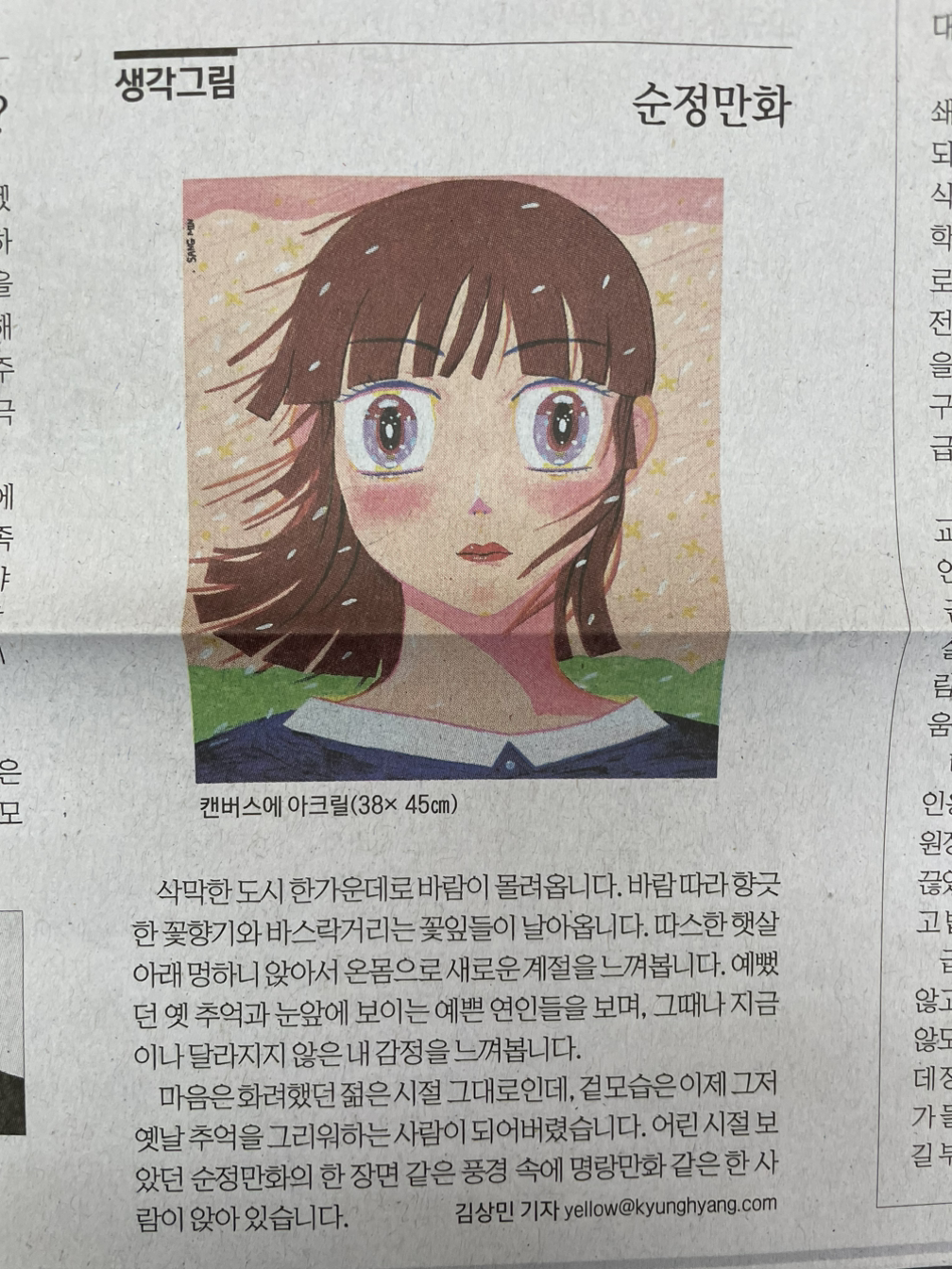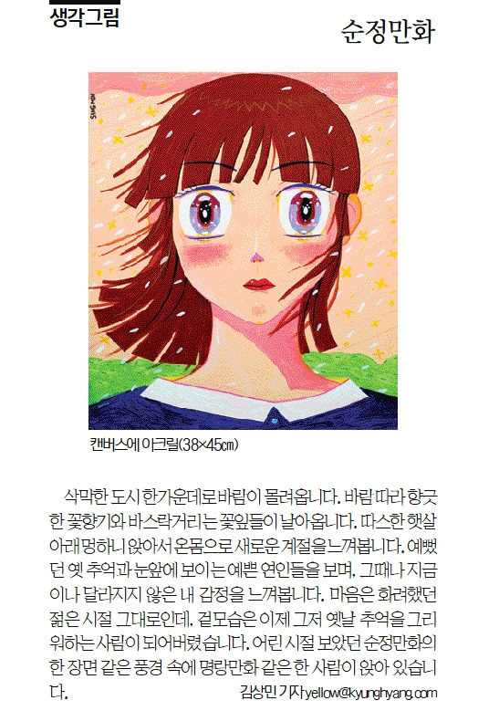 삭막한 도시 한가운데로 바람이 몰려옵니다. 바람 따라 향긋한 꽃 향기와, 바스락거리는 꽃잎들이 날아옵니다. 따스한 햇살아래 멍하니 앉아서 온몸으로 새로운 계절을 느껴 봅니다. 예뻤던 옛 추억과 눈앞에 보이는 예쁜 연인들을 보며, 그때나 지금이나 달라지지 않은 내 감정을 느껴 봅니다. 마음은 화려했던 젊은 시절 그대로인데, 겉모습은 이제 그저 옛날 추억을 그리워하는 사람이 되어 버렸습니다. 어린 시절 보았던 순정만화의 한 장면 같은 풍경 속에 명랑만화 같은 한 사람이 앉아 있습니다.