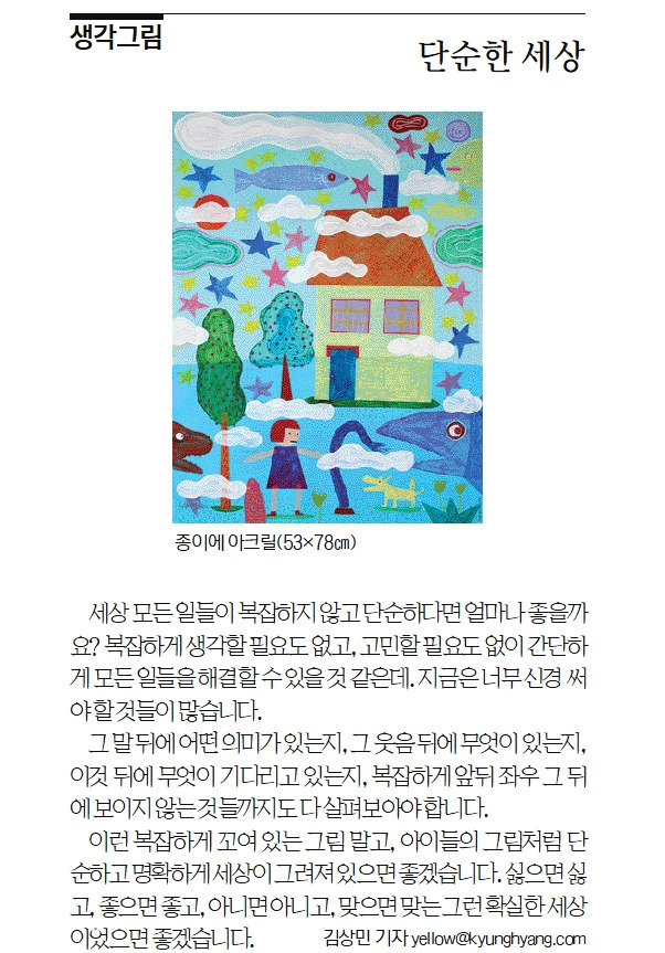 세상 모든 일들이 복잡하지 않고 단순하다면 얼마나 좋을까요? 복잡하게 생각할 필요도 없고, 고민할 필요도 없이 간단하게 모든 일들을 해결할 수 있을 거 같은데. 지금은 너무 신경 써야 할 것들이 많습니다. 그 말 뒤에 어떤 의미가 있는지? 그 웃음 뒤에 무엇이 있는지? 이것 뒤에 무엇이 기다리고 있는지? 복잡하게 앞 뒤 좌 우 그 뒤에 보이지 않는 것들까지도 다 살펴보아야 합니다. 이런 복잡하게 꼬여있는 그림 말고, 아이들의 그림처럼 단순하고 명확하게 세상이 그려져 있으면 좋겠습니다. 싫으면 싫고, 좋으면 좋고, 아니면 아니고, 맞으면 맞는 그런 확실한 세상이었으면 좋겠습니다.