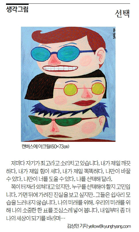 저마다 자기가 최고라고 소리치고 있습니다. 내가 제일 깨끗하다. 내가 제일 힘이 세다. 내가 제일 똑똑하다. 나만이 바꿀 수 있다. 나만이 너를 도울 수 있다. 나를 선택해 달라. 목이 터져라 외쳐대고 있지만, 누구를 선택해야 할지 고민입니다. 가면 뒤에 가려진 진실을 보고 싶지만, 그들은 쉽사리 모습을 드러내지 않습니다. 나의 미래를 위해, 우리의 미래를 위해 나의 소중한 한 표를 조심스래 넣어 봅니다. 내일부터 좀 더 나의 세상이 되기를 바라며...