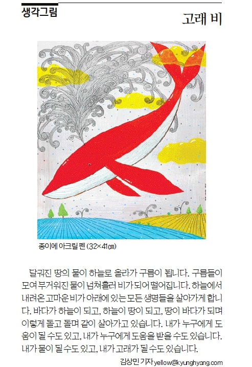 달궈진 땅의 물이 하늘로 올라가 구름이 됩니다. 구름들이 모여 무거워진 물이 넘쳐흘러 비가 되어 떨어집니다. 하늘에서 내려온 고마운 비가 아래에 있는 모든 생명들을 살아가게 합니다. 바다가 하늘이 되고, 하늘이 땅이 되고, 땅이 바다가 되며 이렇게 돌고 돌며 같이 살아가고 있습니다. 내가 누구에게 도움이 될 수도 있고, 내가 누구에게 도움을 받을 수도 있습니다. 내가 물이 될 수도 있고, 내가 고래가 될 수도 있습니다.