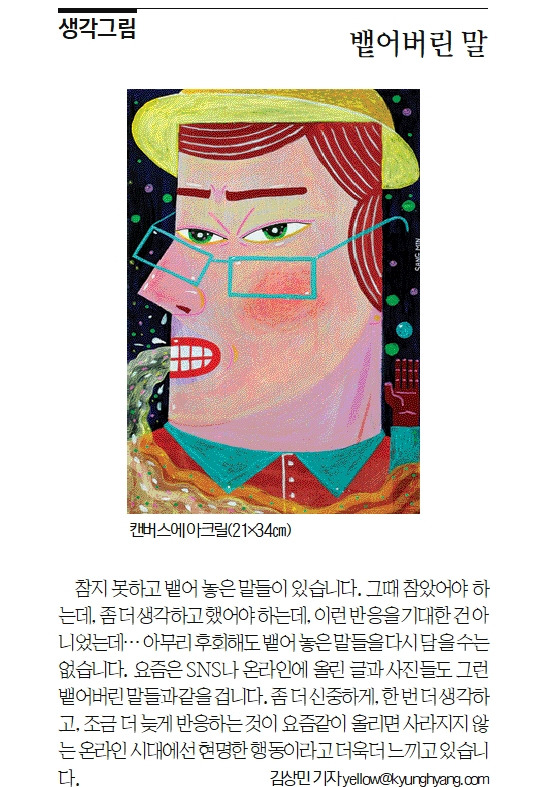 참지 못하고 뱉어 놓은 말들이 있습니다. 그때 참았어야 하는데, 좀 더 생각해고 했어야 하는데, 이런 반응을 기대한 건 아니었는데, 아무리 후회해도 뱉어 놓은 말들을 다시 담을 수는 없습니다. 요즘은 SNS나 온라인에 올린 글과 사진들도 그런 뱉어버린 말들과 같을 겁니다. 좀 더 신중하게, 한 번 더 생각하고, 조금 더 늦게 반응하는 것이 요즘 같이 한번 올리면 사라지지 않는 온라인 시대에 현명한 행동이라고 더욱더 느끼고 있습니다.