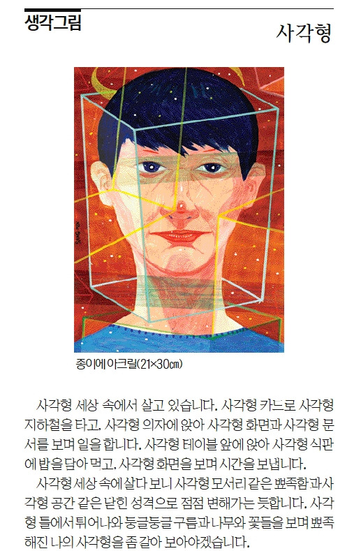 사각형 세상 속에서 살고 있습니다. 사각형 카드로 사각형 지하철을 타고, 사각형 의자에 앉아 사각형 화면과 사각형 문서를 보며 일을 합니다. 사각형 테이블에 앉아 사각형 식판에 밥을 먹고, 사각형 화면을 보며 시간을 보냅니다. 사각형 세상 속에 살다 보니 사각형 모서리 같은 뾰족함과 사각형 공간 같은 닫힌 성격으로 점점 변해 가는듯합니다. 사각형틀에서 튀어나와 둥글둥글 구름과 나무와 꽃들을 보며 뾰족해진 나의 사각형을 좀 갈아보아야겠습니다.