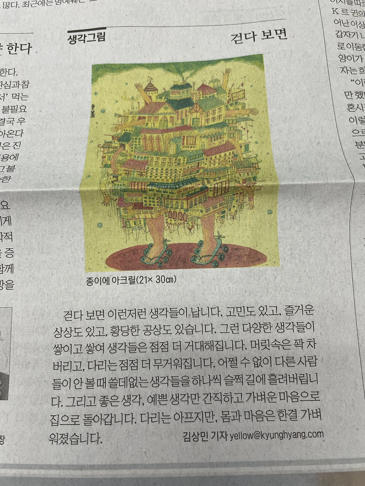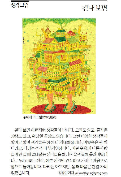 걷다 보면 이런저런 생각들이 납니다. 고민도 있고, 즐거운 상상도 있고, 황당한 공상도 있습니다. 그런 다양한 생각들이 쌓이고 쌓여 생각들은 점점 더 거대해집니다. 머릿속은 꽉 차버리고, 다리는 점점 더 무거워집니다. 어쩔 수 없이 다른 사람들이 안 볼 때 쓸데없는 생각들을 하나씩 슬쩍 길에 흘려버립니다. 그리고 좋은 생각, 예쁜 생각만 간직하고 가벼운 마음으로 집으로 돌아갑니다. 다리는 아프지만, 몸과 마음은 한결 가벼워졌습니다.
