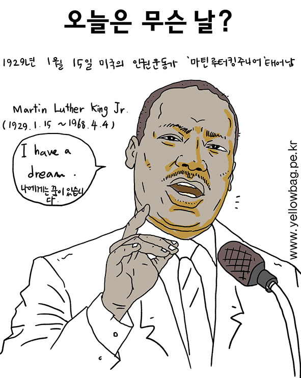 1929년 1월 15일 미국 인권운동가, 침례교 목사 마틴 루터 킹 주니어 태어남. 그는 공영버스의 흑인 좌석 차별사건에 비폭력 시위를 이끌어 승리하여 그 뒤 흑인 해방, 인권운동을 주도했다. 1963년 링컨 기념관 앞에서 "나에겐 꿈이 있습니다."라는 인종차별 철폐와 각 인종 간의 공존이라는 주제를 간결한 문체와 평이한 말로 호소해 넓은 공감을 불러일으켰다. 이후 1964년 노벨 평화상을 수상하였고, 1968년 백인 우월주의자의 총에 맞아 사망하였다.