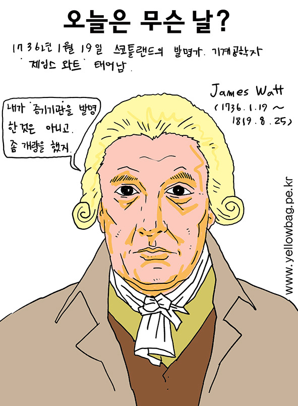 1736년 1월 19일 스코틀랜드의 발명가이자 기계공학자 제임스 와트가 태어남. 그는 증기기관을 발명했다고 알려졌지만, 실제로는 기존의 증기기관에 단점을 대폭 개선하고 새로운 응축기를 부착하여 효율을 높인 와트식 증기기관을 발명하고 특허를 내었다. 그가 증기기관을 개량하여 산업혁명을 이루게 하였다. 영국에서는 제임스 와트의 이름을 딴 와트(기호 W)라는 단위를 만들기도 했다.