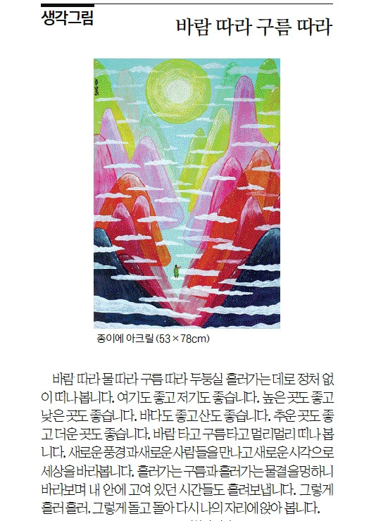 바람 따라 물 따라 구름 따라 두둥실 흘러가는 데로 정처 없이 떠나 봅니다. 여기도 좋고 저기도 좋습니다. 높은 곳도 좋고 낮은 곳도 좋습니다. 바다도 좋고 산도 좋습니다. 추운 곳도 좋고 더운 곳도 좋습니다. 바람 타고 구름 타고 멀리멀리 떠나 봅니다. 새로운 풍경과 새로운 사람들을 만나고 새로운 시각으로 세상을 바라봅니다. 흘러가는 구름과 흘러가는 물결을 멍하니 바라보며 내 안에 고여있던 시간들도 흘려보냅니다. 그렇게 흘러 흘러, 그렇게 돌고 돌아 다시 나의 자리에 앉아봅니다.