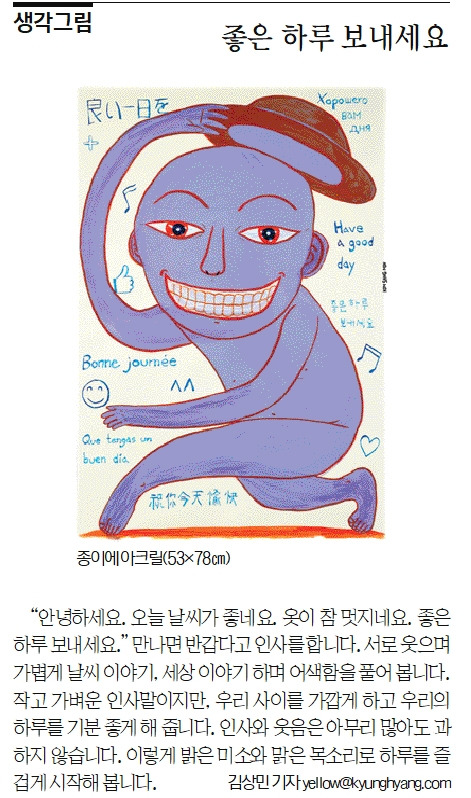 "안녕하세요. 오늘 날씨가 좋네요. 옷이 참 멋지네요. 좋은 하루 보내세요." 만나면 반갑다고 인사를 합니다. 서로 웃으며 가볍게 날씨이야기, 세상이야기 하며 어색함을 풀어 봅니다. 작고 가벼운 인사말이지만, 우리 사이를 가깝게 하고 우리의 하루를 기분 좋게 해 줍니다. 인사와 웃음은 아무리 많아도 과하지 않습니다. 이렇게 밝은 미소와 맑은 목소리로 하루를 즐겁게 시작해 봅니다.