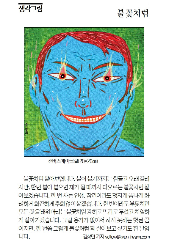 불꽃처럼 살아 보렵니다. 불이 붙기까지는 힘들고 오래 걸리지만, 한번 불이 붙으면 재가 될 때까지 타오르는 불꽃처럼 살아 보겠습니다. 한 번 사는 인생. 잠깐이라도 멋지게 폼나게 화려하게 화끈하게 후회 없이 살겠습니다. 한 번이라도 부딪치면 모든 것을 태워버리는 불꽃처럼 강하고 뜨겁고 무섭고 치열하게 살아가겠습니다. 그럴 용기가 없어서 하지 못하는 헛된 꿈이지만, 한 번쯤 그렇게 불꽃처럼 확 살아보고 싶기도 한 날입니다.