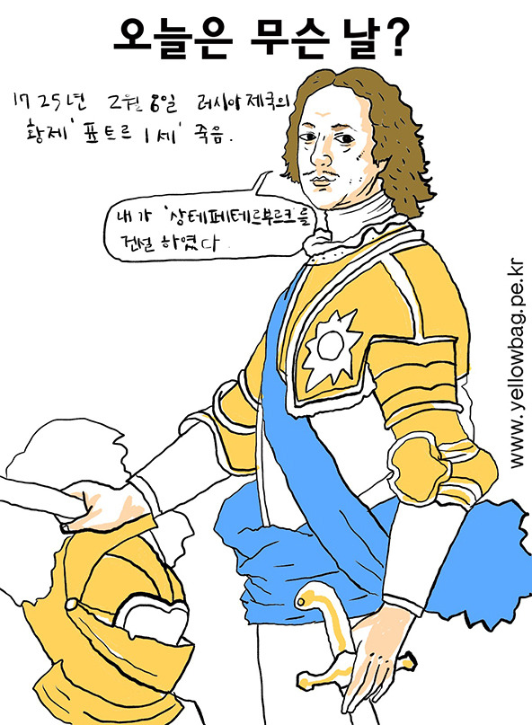 1725년 2월 8일 러시아 제국 로마노프 왕조의 황제 표트르 대제 죽음. 그는 어린 시절 왕위 다툼에 밀려 외국인촌에서 생활했다. 거기서 서유럽 선진국가들의 기술자들과 접촉하면서 첨단기술을 보고 배웠다. 황제가 되고서도 서유럽에 사절단을 보낼 때 신분을 속이고 자기가 직접 가서 선진문물을 배웠다. 귀국한 뒤에는 서유럽식 풍속과 관습, 국가행정 등을 개혁해 러시아의 근대화를 가속화했다. 또 군비증강을 통해 오스만 제국과 스웨덴과의 전쟁에서 승리하여 영토를 확장했다. 발트해 연안의 황무지를 개간하여 상트페테르부르크를 건설하였고 새로운 수도로 정하였다. 이 새로운 수도는 '유럽으로 열린 창', '러시아의 머리'로 불리며 러시아의 서구화에 앞장섰다. 후에 1905년 피의 일요일 사건으로 러시아 공산혁명의 무대가 되었고, 2차 세계대전에서 독일군과 싸워 '영웅도시'라는 칭호도 받았다.